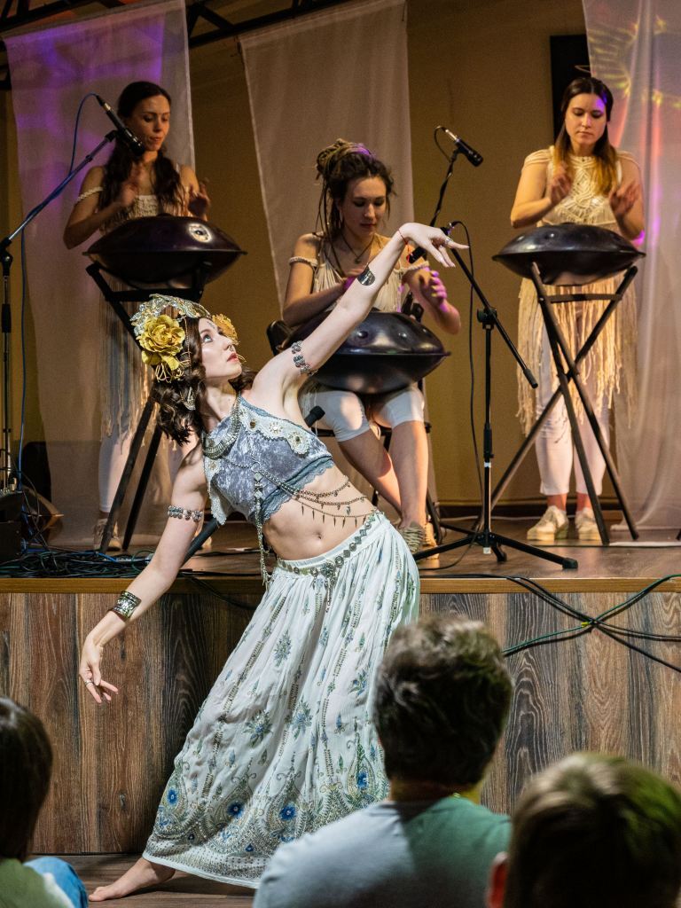 Огромный опыт выступлений с 2015 года: дни рождения, корпоративные мероприятия, свадьбы, рекламные акции, показы мод, музыкальные и тематические фестивали (Дикая Мята, Yoga Day).